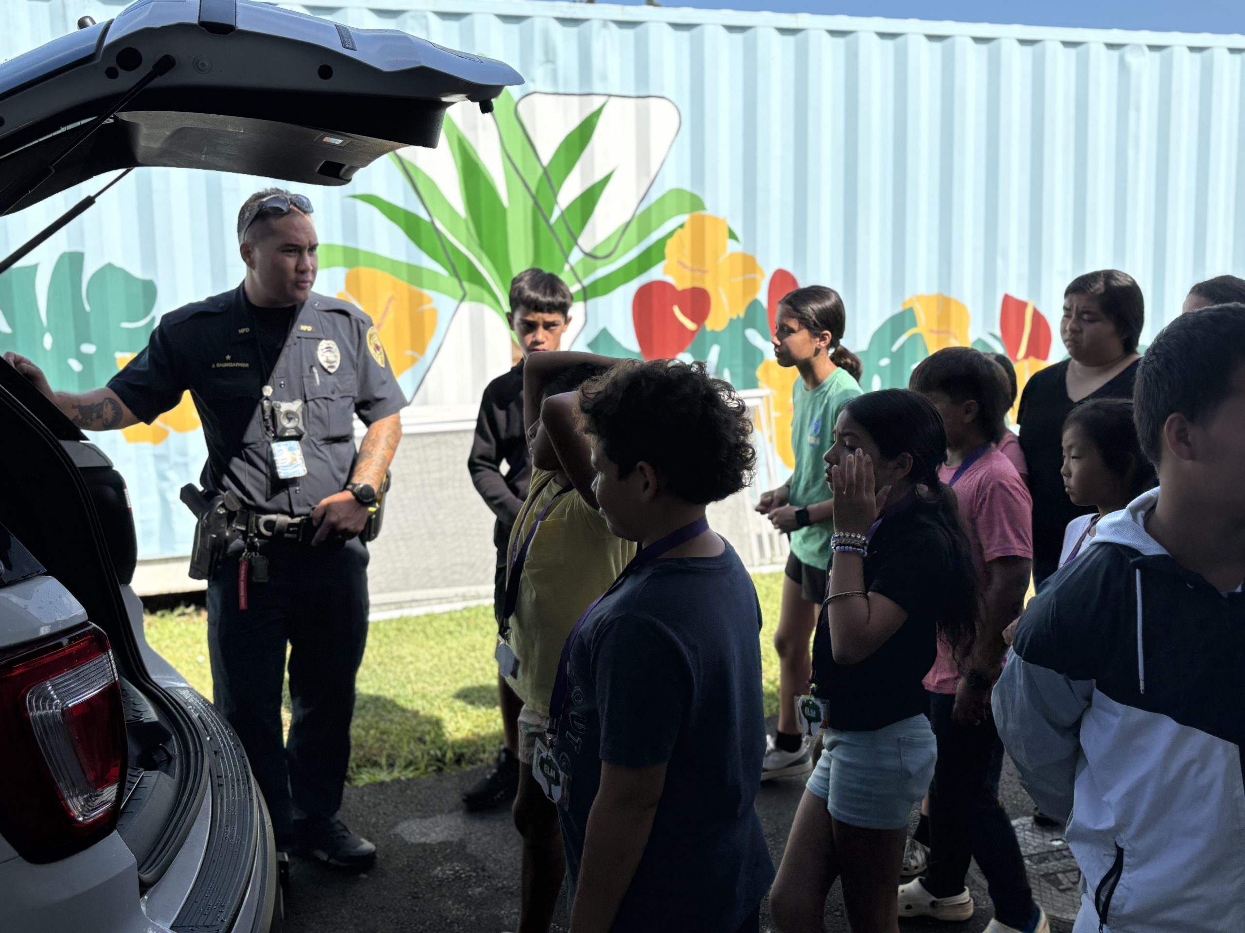 A Hawai‘i County police officer shows a group of keiki his patrol car at Friends of First Responders Hawai‘i Island’s first keiki camp earlier this month. | Courtesy: Friends of First Responders Hawai‘i Island