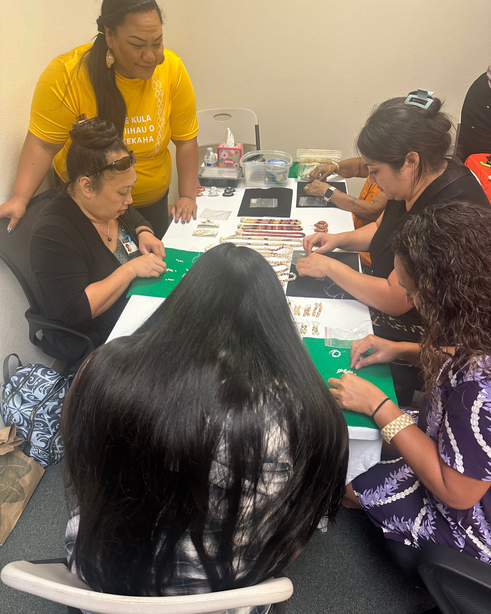 Community members make Ni‘ihau shell earrings at Ho‘omana I Ka Lāhui workshops earlier this year. | Courtesy: Kawena Bagano, Ho‘omana I Ka Lāhui
