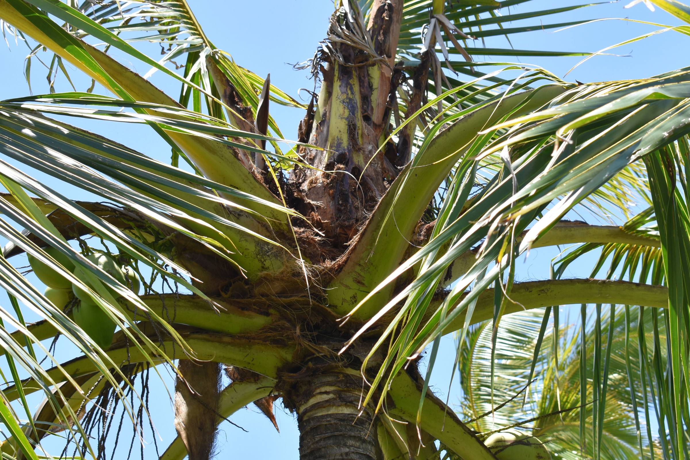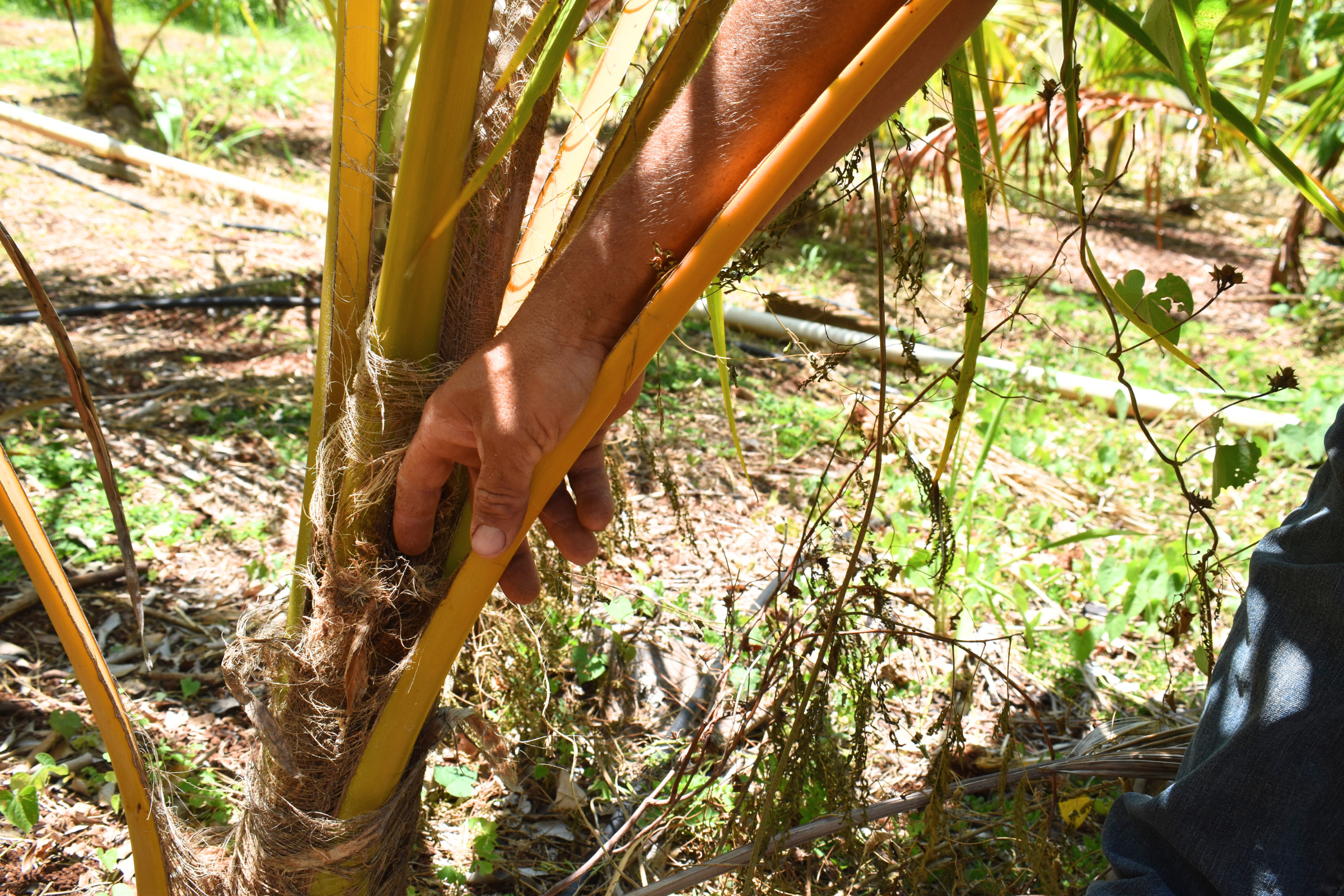 The farmer I’m with estimates that beetles have damaged 60% to 80% of his adult coconut trees—and they’ve started to eat a couple of his banana trees.